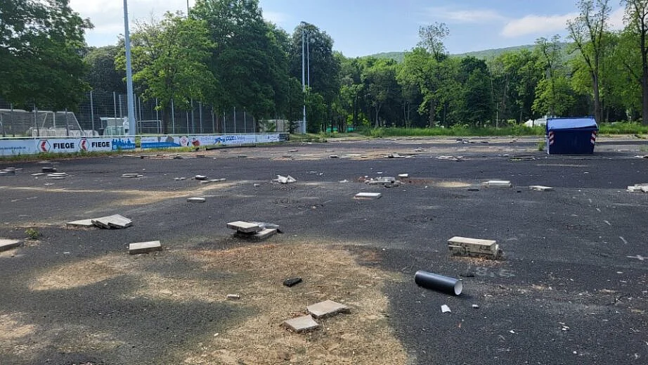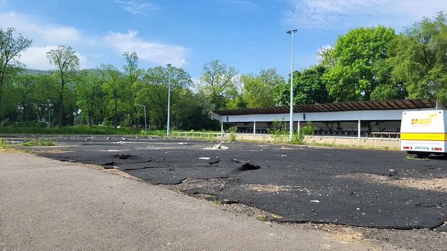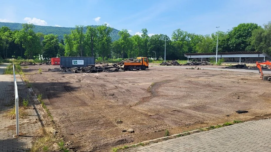 Nach Abzug der Notunterkünfte im April 2025 wurden durch die AuEG die ersten Arbeiten eingeleitet. Aktuell wird die alte Sportplatzunterlage (Gummigranulat Matten) und die asphaltierten Flächen der Notunterkünfte aufgenommen und entsorgt. Im Anschluss werden Kampfmittel- und Baugrunduntersuchung durchgeführt. Die Ausschreibungen für die eigentliche Sportplatzsanierung werden derzeit vorbereitet. Nach Abschluss der Neuverlegung einer Wasserleitung über das Sportfeld im Herbst 2025 wird mit der Sanierung des Sportplatzes im 1. Quartal 2026 begonnen. Der Sportplatz soll im Mai 2026 fertiggestellt sein.
