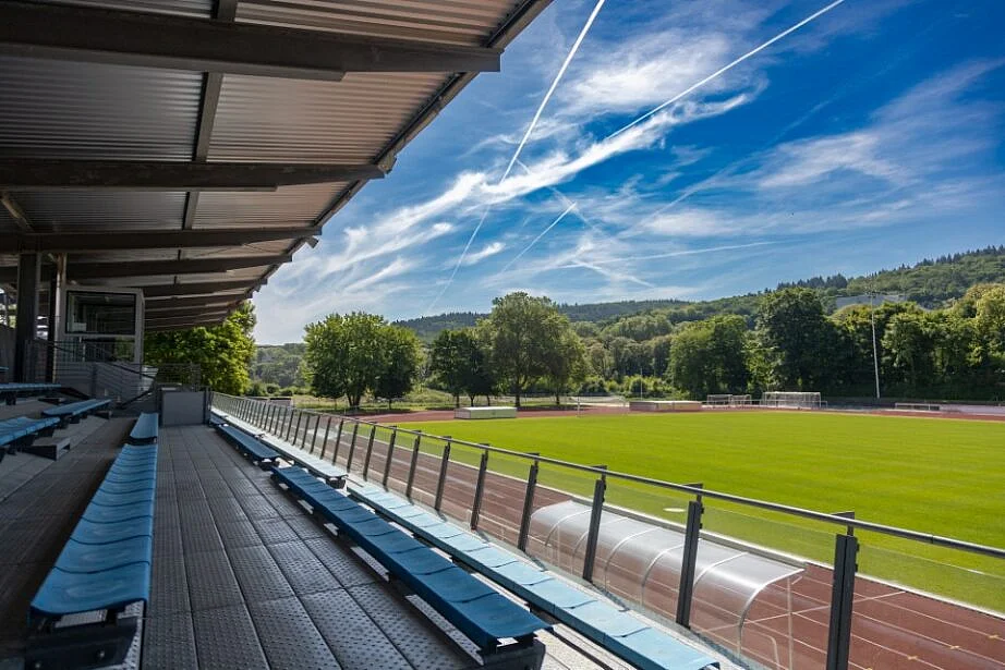 Tribüne: Das Tribünengebäude wurde im Erdgeschoss vollständig entkernt. Die Vorplanungen sind abgeschlossen, die finalen Planungsentwürfe und die Kostenaufstellungen liegen vor. Auf der Rückseite der Tribüne wurden die temporären DFB-Umkleidecontainer aufgestellt, installiert und in Betrieb genommen. Mit der Sanierung der Tribünenumkleiden wurde noch im Dezember 2023 begonnen und Ende 2024 abgeschlossen. Der Wechsel auf Fernwärme wurde im April 2024 in Zusammenarbeit mit den Ahrtalwerken durchgeführt. Im Sockelbereich stehen noch Abdichtungsarbeiten an. Das Tribünengebäude ist ansonsten fertig flutschadensaniert.